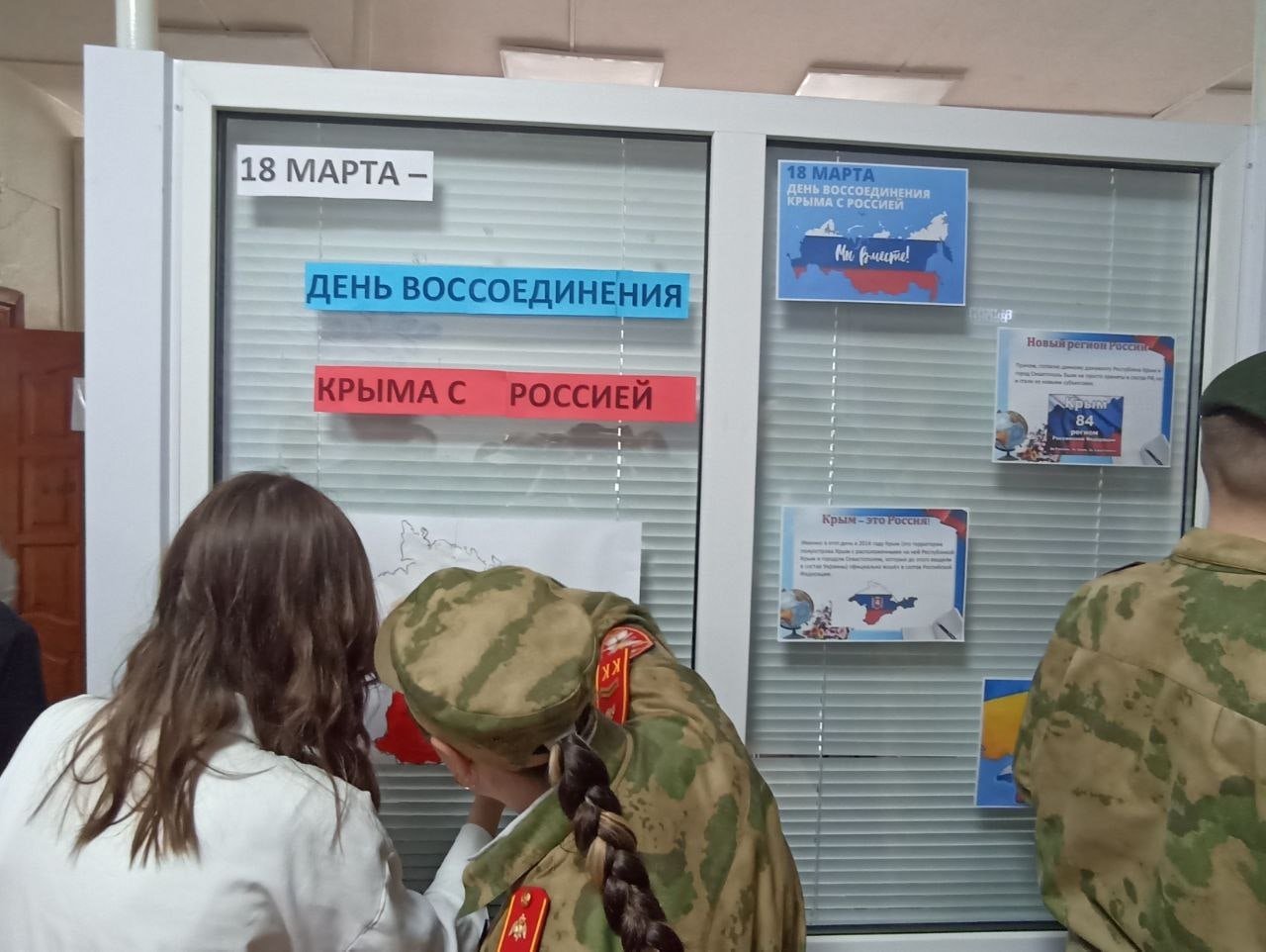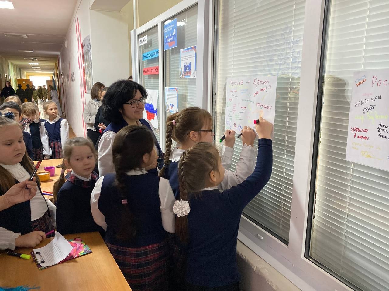 Актив школы подготовил стенд, на котором разместили информацию об истории воссоединения Крыма с Россией, а также изображение полуострова и чистые листы.