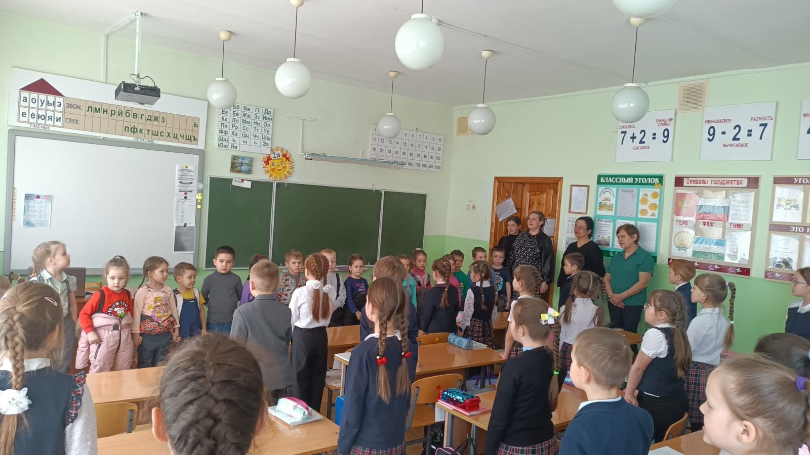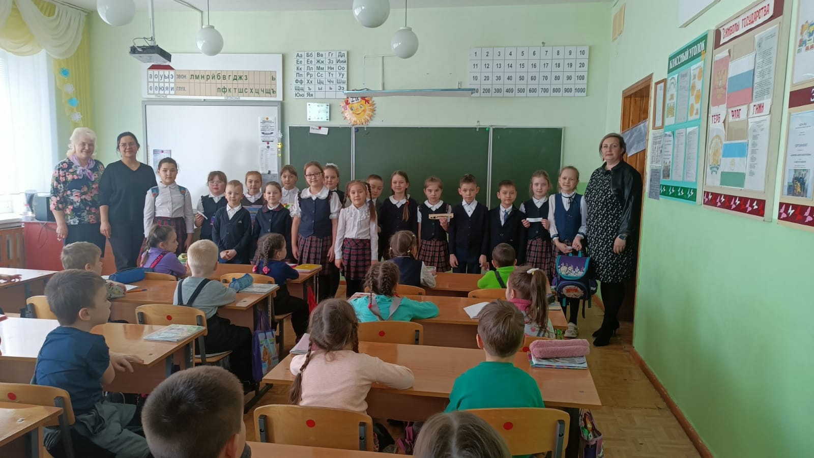 Пройдя по просторному коридору школы, ребята заглянули в классы, посетили спортивный зал, посмотрели выставку работ учеников начальных классов, посетили кадетский класс.