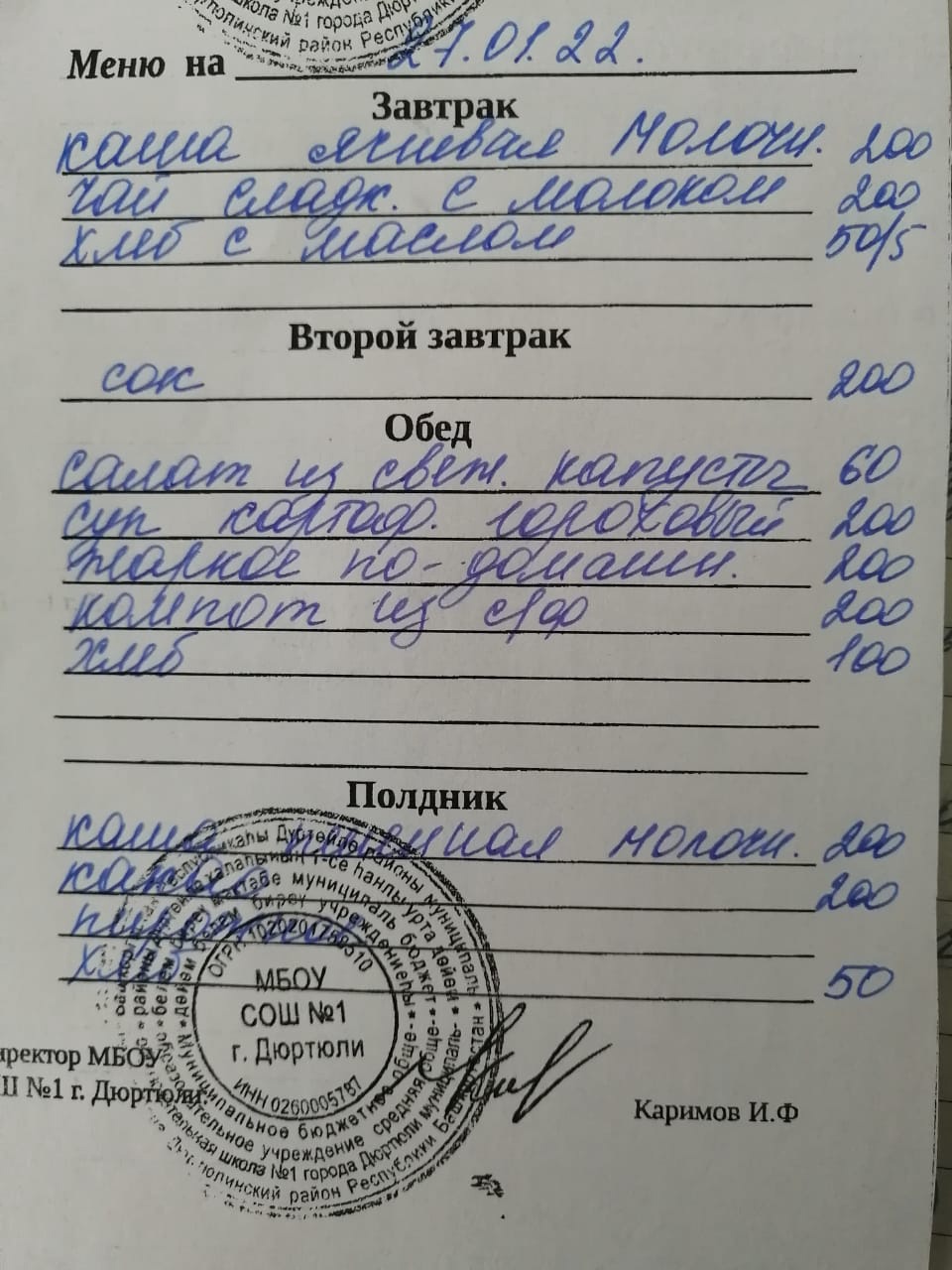 Фото рациона на 27.01.2022