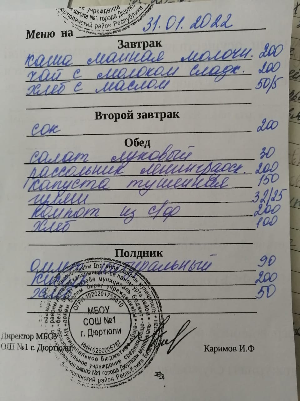 Фото рациона на 31.01.2022