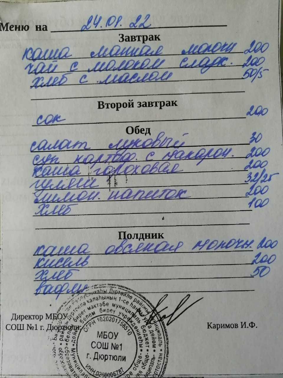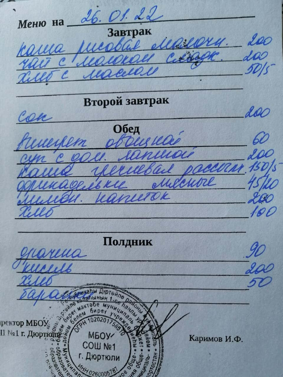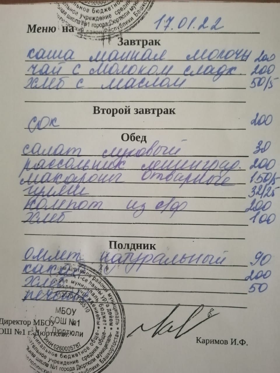 Фото рациона на 17.01.2022