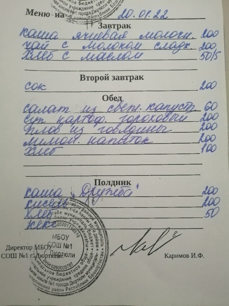 Фото рациона на 20.01.2022