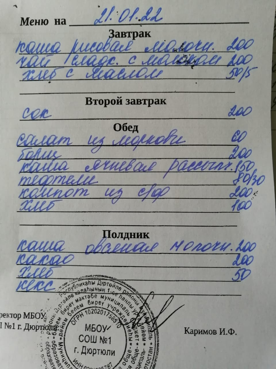 Фото рациона на 13.01.2022