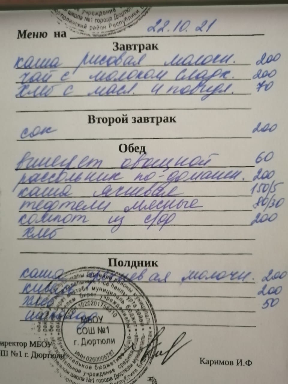 Фото рациона на 22.10.2021