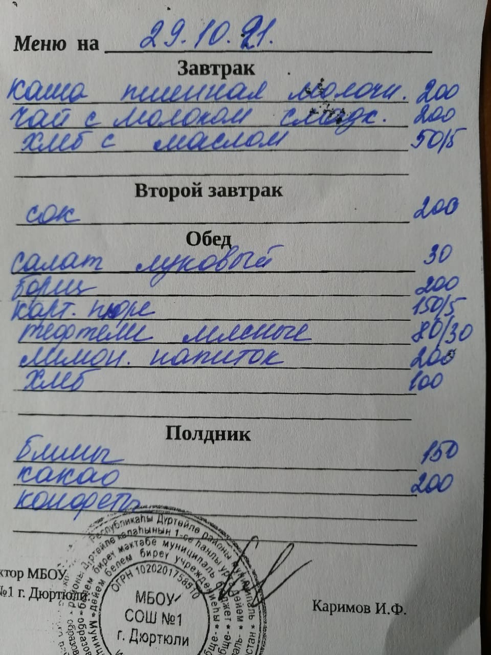 Фото рациона на 29.10.2021