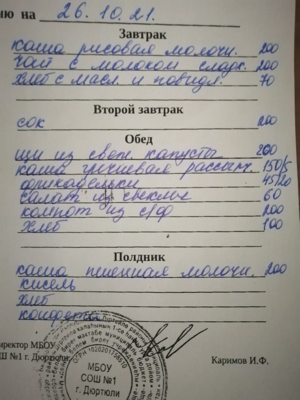 Фото рациона на 26.10.2021