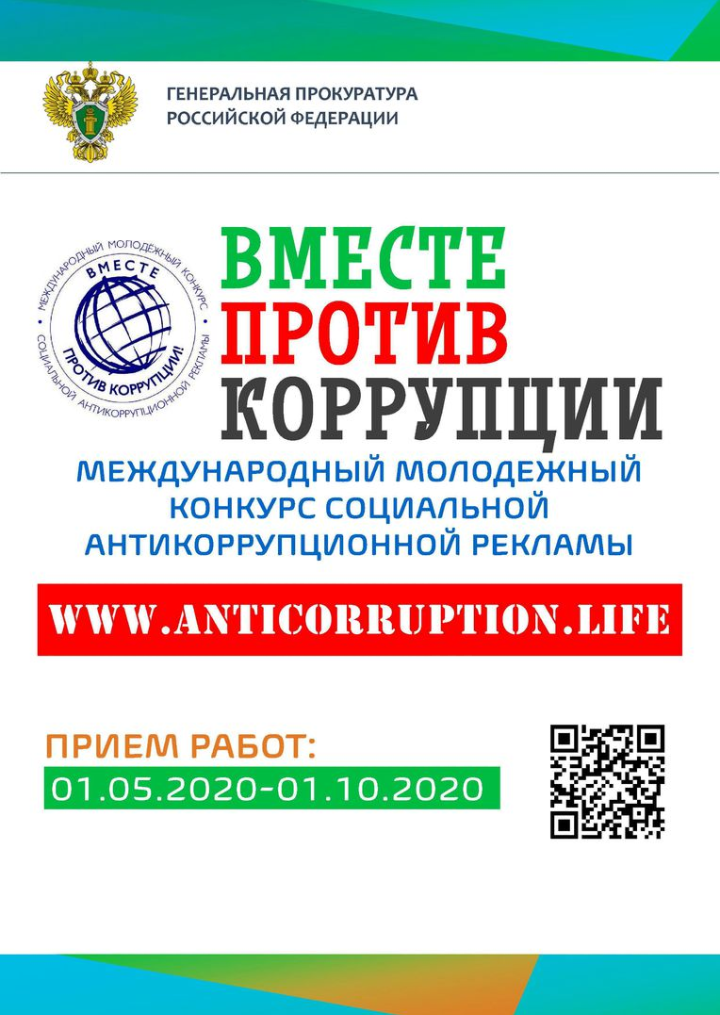 Генеральной прокуратурой Российской Федерации организован Международный молодежный конкурс социальной антикоррупционной рекламы «Вместе против коррупции!» Прием конкурсных работ будет проводиться с 1.05.2020 по 1.10.2020 на официальном сайте конкурса http://www.anticorruption.life